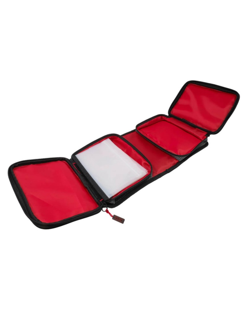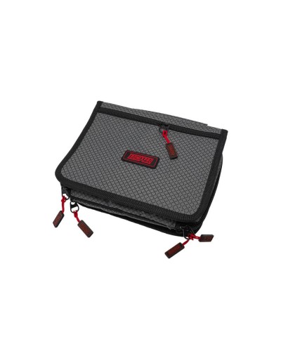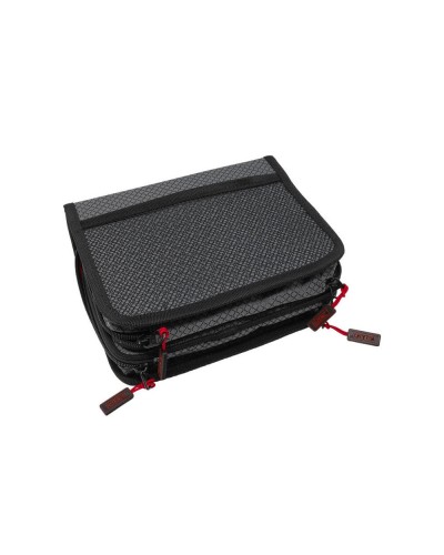 - El organizador de señuelos Match Organiser Tronixpro de doble cara que cuenta con dos bolsillos internos con cremallera independientes. Los dos lados de la bolsa se pliegan y se aseguran con velcro, lo que le brinda una bolsa de aparejos limpia y compacta.