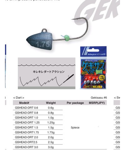La JIG HEAD MAJOR CRAFT ROCKLIVER DART es una cabeza para pescar a rockfishing con pequeños vinilos en la modalidad de darting. Los anzuelos vienen recubiertos de Teflón para una mayor penetracción en la clavada y poseen un pequeño retén para que el vinilo no se desplace por la tija. Se venden en blisters de 5 unds.