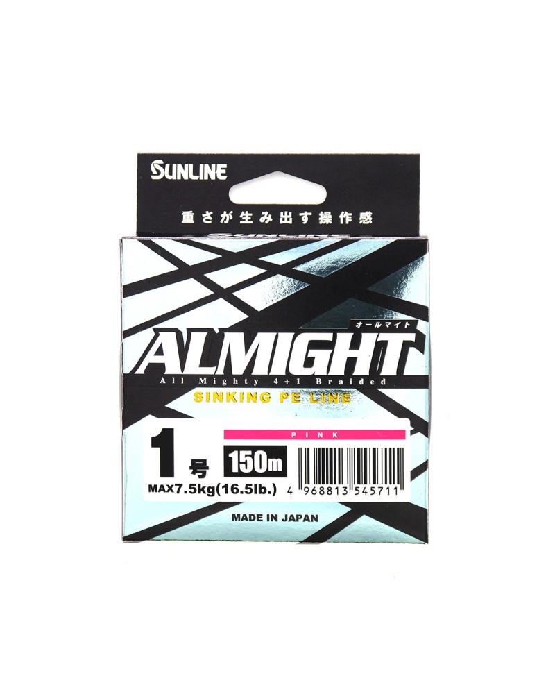 La nueva línea trenzada de SUNLINE ALMIGHT 5X está formada por cuatro hebras IZANAS convencionales, que abrazan a una de mayor densidad, lo que hace que la línea, en vez de mantenerse a flote, se sumerja. Estamos pues hablando de una línea sinking que favorecerá el movimientos de nuestros egis ya que los acompaña en su descenso sin interferir en su movimiento. Esta es una línea ideal para la pesca al eging, tanto por su condición de "sinking", como por el color rosa, que se nos hará visible en los momentos de poca luz, como por su alta resistencia a la abrasión.