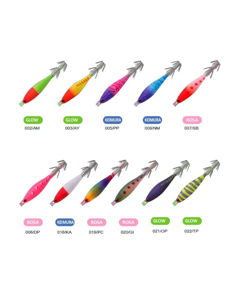 Está disponible en una gran variedad de colores, lo que te permite adaptarte a una amplia gama de situaciones de pesca, condiciones de luz o preferencias de los calamares en tu zona. Y para asegurar las picadas, viene equipado con una doble corona extremadamente afilada y resistente, diseñada para clavar firmemente y aguantar la fuerza de los cefalópodos.
